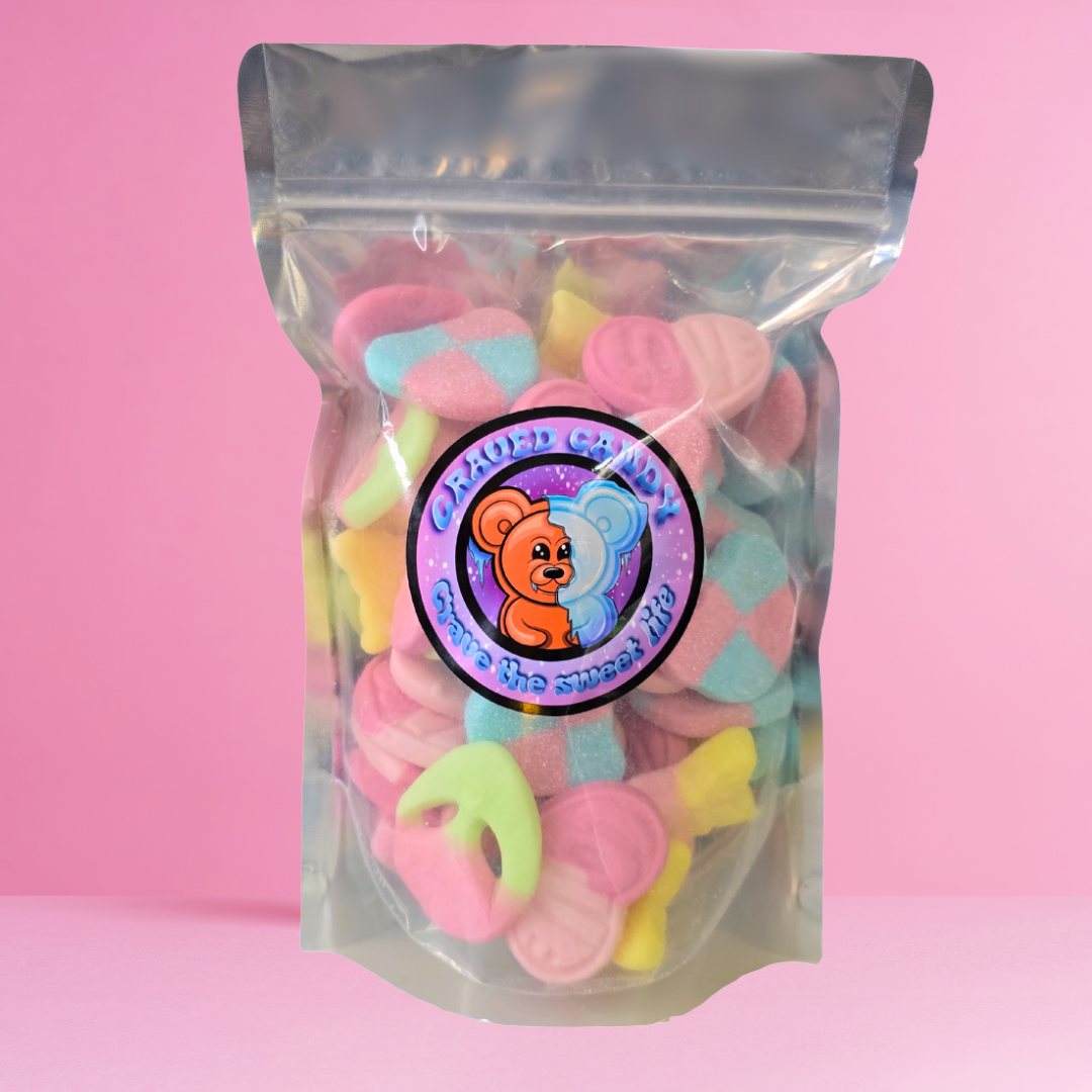 The 1lb mix includes blue raspberry/strawberry sour bears, pink lemonade sour butterflies, strawberry cream heart ovals, watermelon aliens and passionfruit aliens!